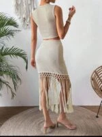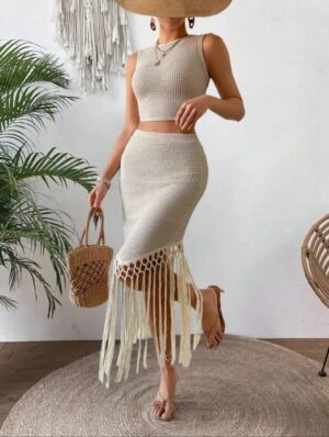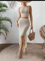طقم من قطعتين من Breezaya للنساء: توب بلون سادة برقبة دائرية وأكمام قصيرة مكشوفة الكتفين، مع تنورة مزينة بشراشيب.