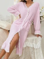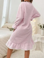 روب دانتيل بلون متضاد، بأكمام واسعة، كشكشة مخططة، وجيوب من قماش الفلانيل.