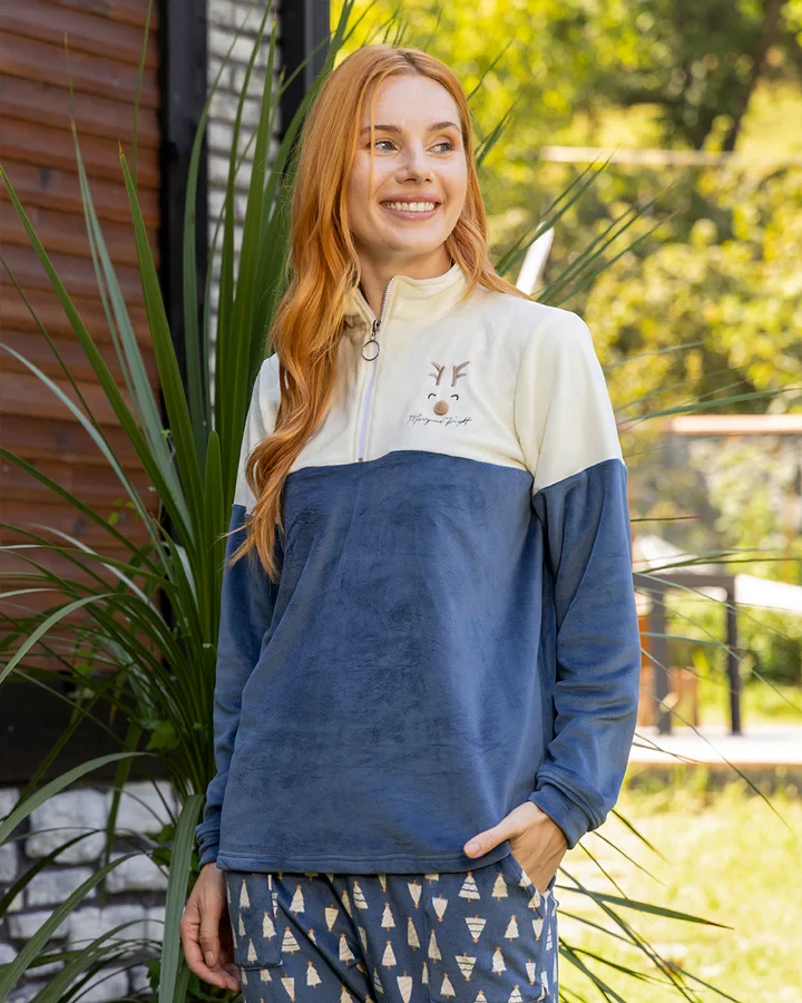 استمتعي بالراحة والدفء بارتداء بيجامات وجه الغزال الفاخرة هذه. مصنوعة من قماش مخملي ناعم، تتميز هذه البيجامات بجزء علوي من القطيفة القطنية السادة وبنطلون مخملي قطني مطبوع. متوفرة باللون البترولي ومقاسات S-3XL، هذه البيجامات مثالية للاسترخاء بأناقة. مصنوعة من البوليستر بنسبة 100%، ناعمة الملمس وستبقيك دافئًا طوال الليل