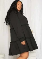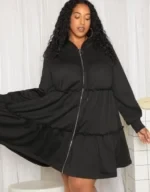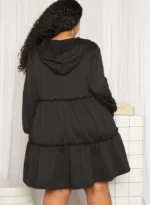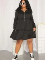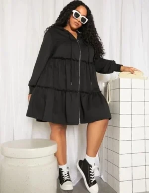 فستان بلس سايز أنيق باللون الأسود، بتصميم واسع مكون من طبقات كشكشة تضيف لمسة أنثوية مميزة. يأتي بسحاب أمامي لسهولة الارتداء وغطاء رأس (هودي) لإطلالة كاجوال مريحة وعصرية. مثالي للخروجات اليومية أو الشتوية الخفيفة.