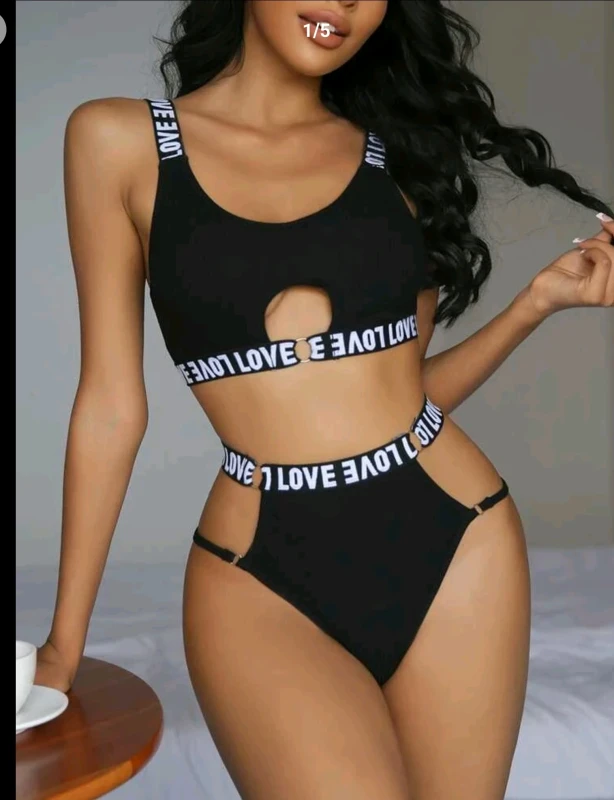 Letter Tape Ring Linked Cut Out Bra & Panty Lingerie Set Sports