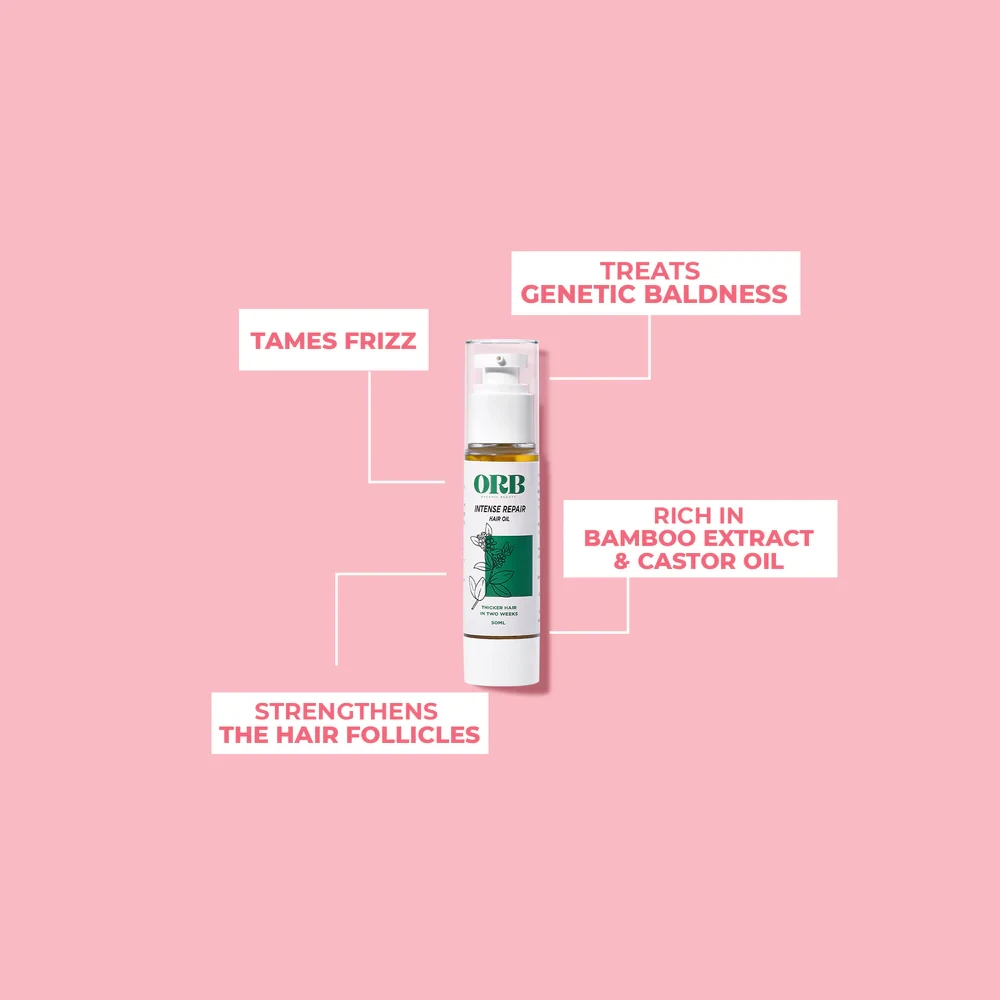 ORB's Intense Repair Hair Oil is a powerful solution for Alopecia, genetic baldness, hair loss, and frizziness. It stimulates follicles, promoting stronger, healthier hair growth. Visible results can be seen in just two to four weeks. For optimal results, use it as part of ORB's primary treatment group, which includes Hair Smoother Oil for straightening and Hair Booster Oil for growth and intensification.
