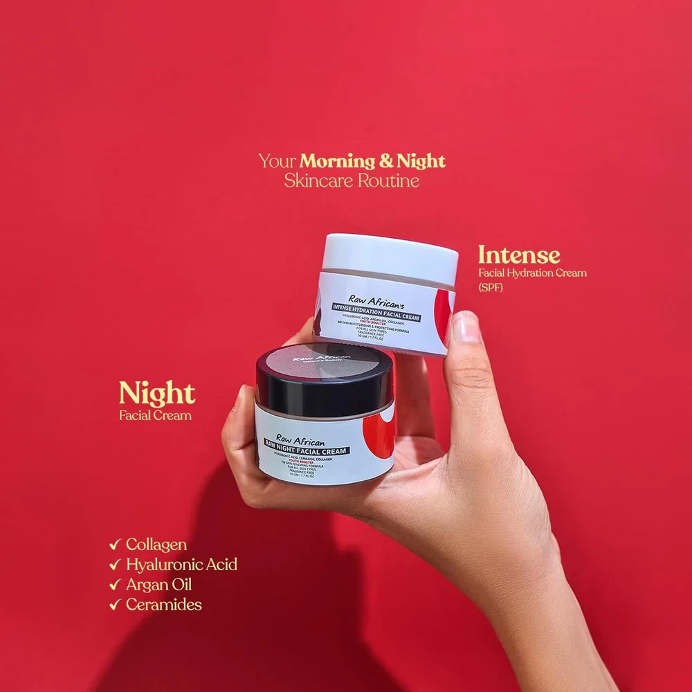 Hydrate and revitalize your complexion with this Raw African Intense Hydration Facial Cream. The inclusion of collagen plays a vital role in providing your skin with improved elasticity and hydration. The cream also works to protects against harmful UV rays whilst the inclusion of natural oils help to moisturize and replenish the skin.