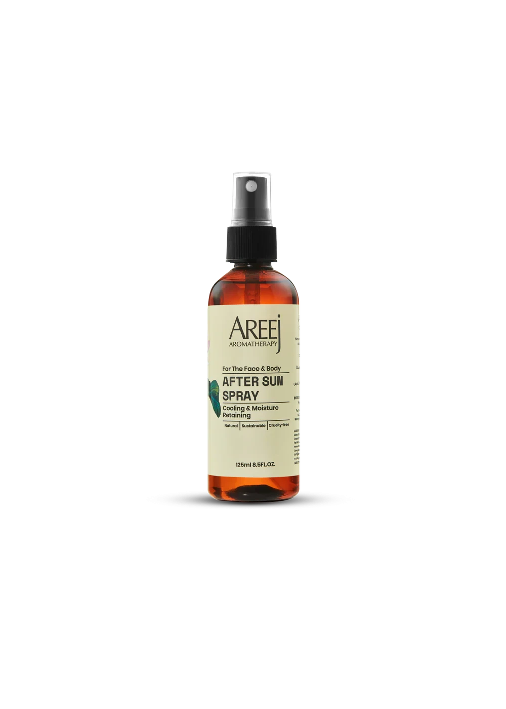 Soothe burnt and damaged skin with the Areej Aromatherapy After Sun Spray. This cooling and hydrating spray will help repair and calm irritated skin due to sun exposure. Formulated with aloe vera and peppermint this all natural spray will also moisturize and rejuvenate your skin. It can also be used on both face and body.