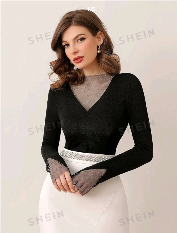 SHEIN Modely Mesh Insert Sheer Black Tee