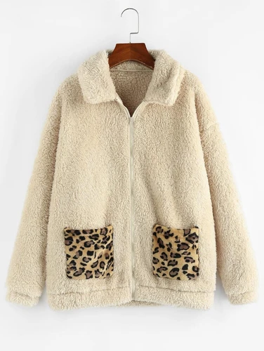 Double leopard pockets add extra wild charm to the coatPlush teddy made of faux fur that falls slightly at the shoulder and is topped with a zippered front