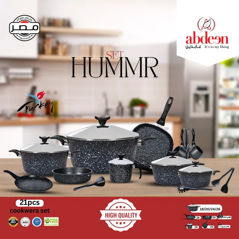 1. طقم هامر ماركة عابدين مكون من 21 قطعة  ماتريال تركي مستوردة  تقفيل وصناعة مصري جرانيت غير قابل لالتصاق توزيع مثالي للحرارة ضمان سنتين ضد عيوب الصناعة