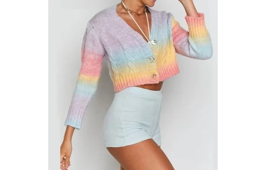 V-Neck Ombre Crop Button-Up Cable Knit Cardigan