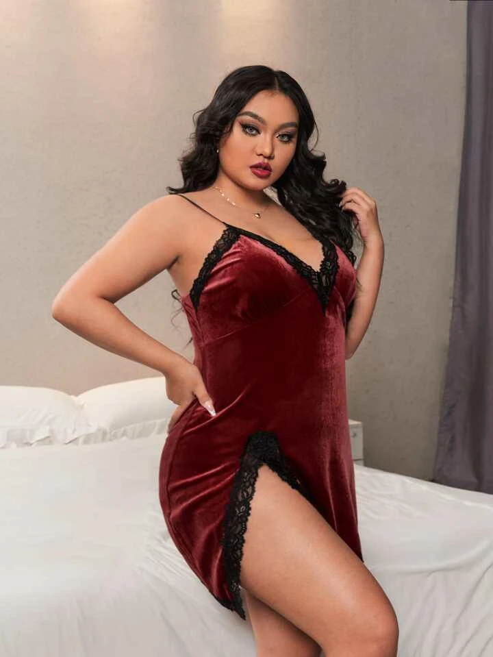 Velvet nightgown with contrasting lace trim and edges and a thigh slit