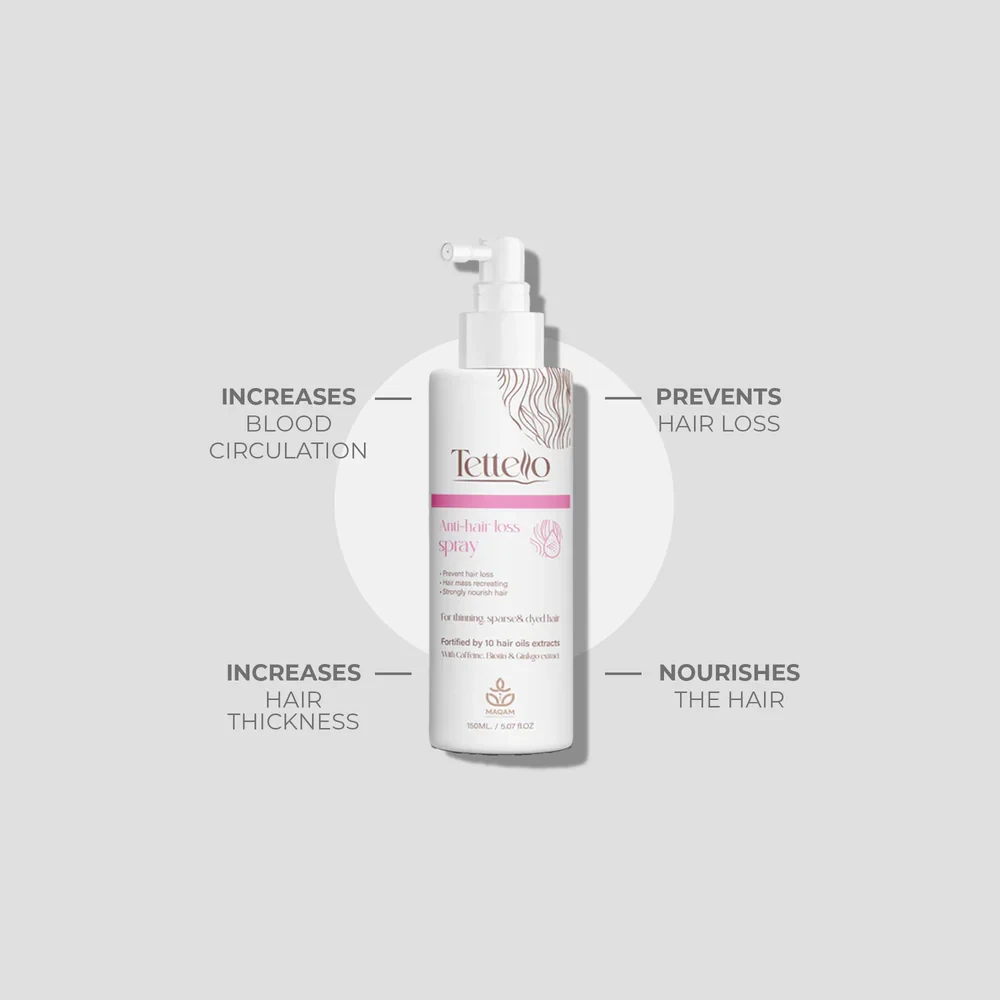 اسبراي تيتيلو هيساعدك بتركيبته الفعّالة تقضى على تساقط و تلف الشعر، تقدرى تستخدميه عشان تنشطى الدروة الدموية فى فروة الرأس و تغذيها بالتالى هيعزز من نمو الشعر و يحسن الخصلات لشعر أكثر قوة و صحة و كثافة.