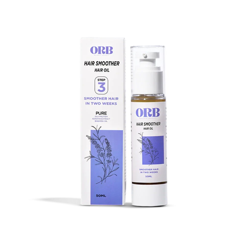 ORB's Hair Smoother Oil, made from organic silk protein and natural keratin extract, is free from sodium, sulfates, and paraffin. It straightens hair strands by 60%, treats dry hair, improves texture, and strengthens from roots to ends. Ideal for enhancing the appearance of curls and waves, especially for those with curly or wavy hair.