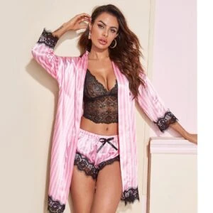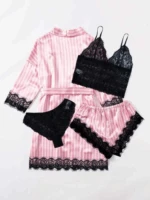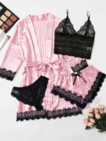 طقم لانجري من الساتان مكون من 5 قطع، يضم روب مزين بدانتيل مخطط بلون متباين.