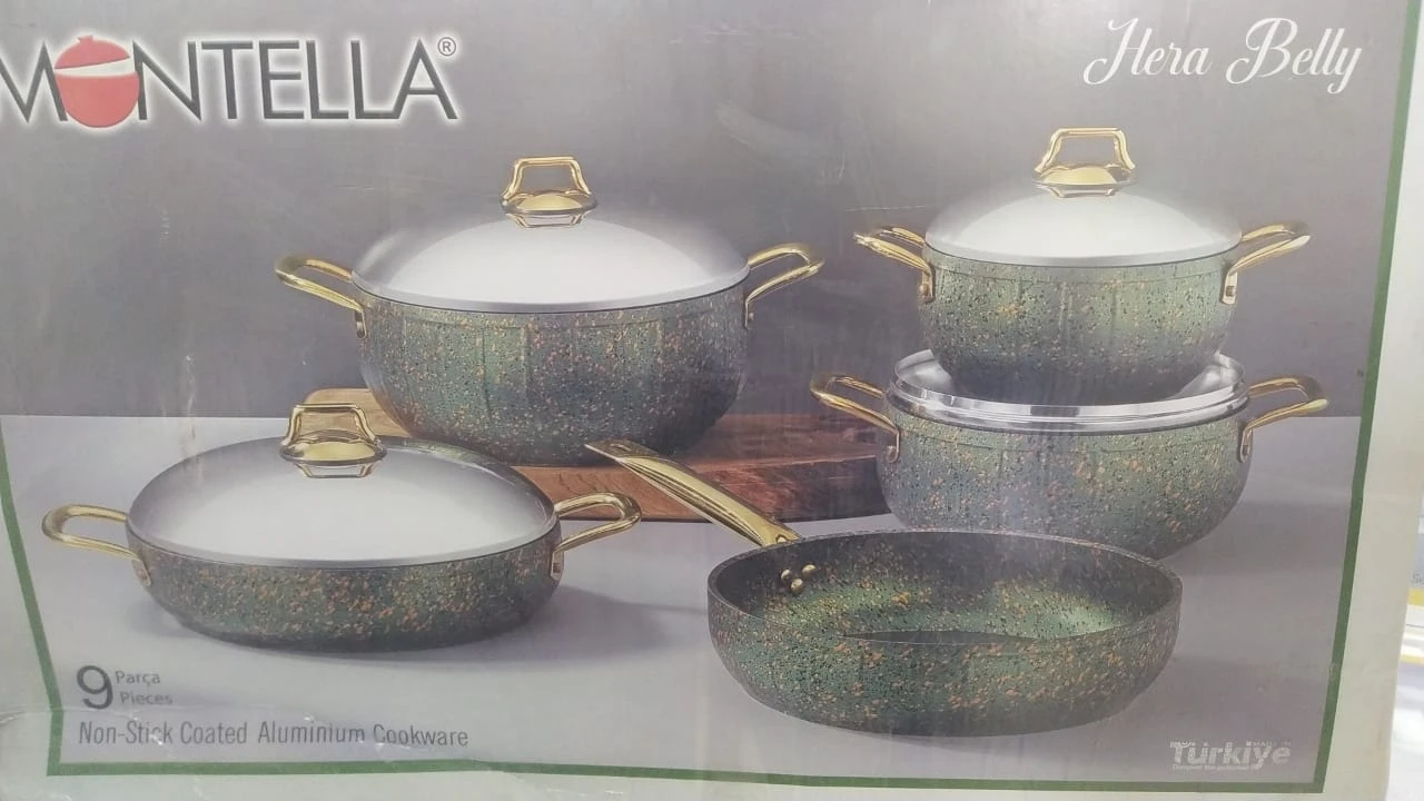 طقم حلل جرانيت تركي مونتيلا بمقابض ذهبية 9 قطعه