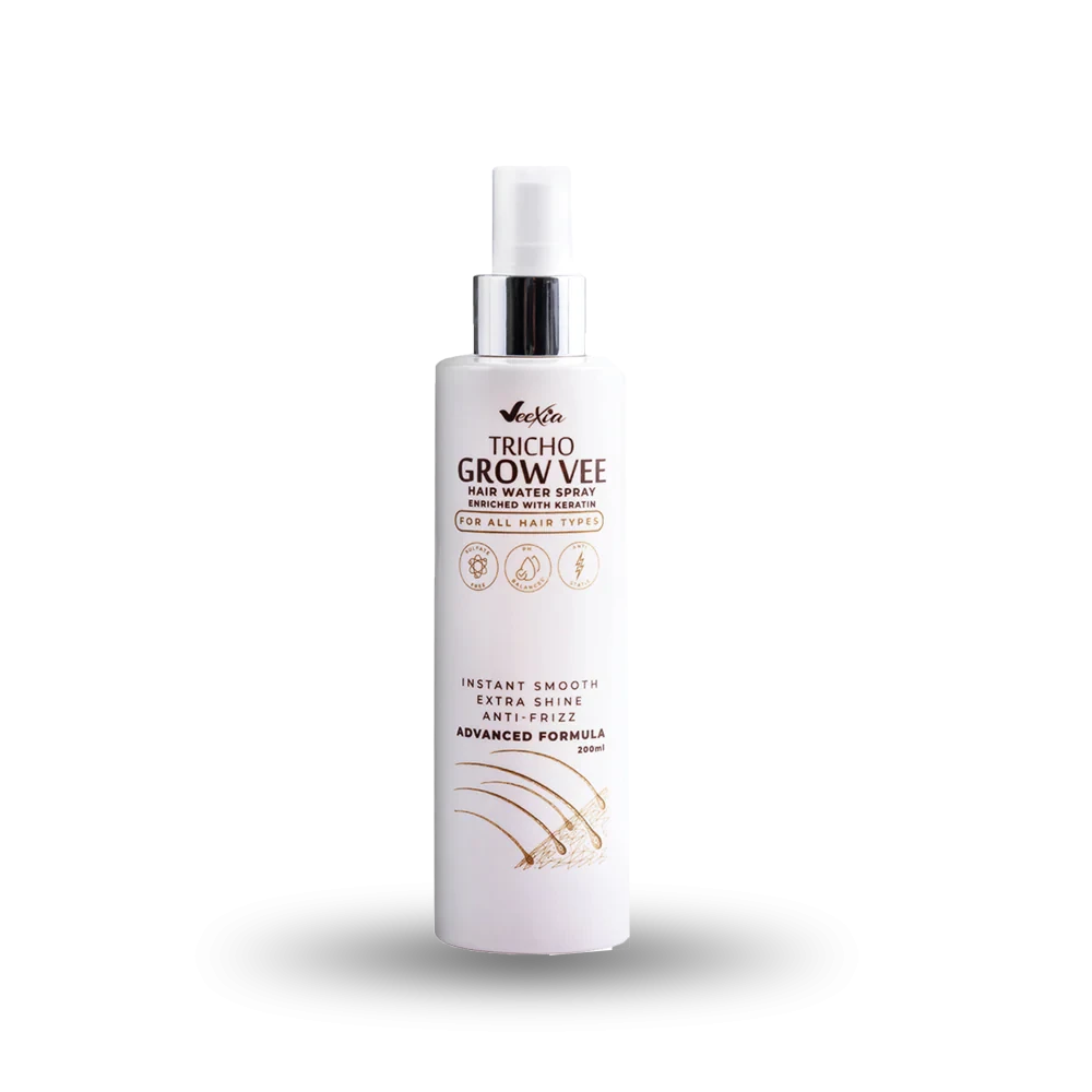 Revitalize and refresh your hair, leaving it soft, smooth, and manageable with Tricho Grow Vee Hair Water Spray! Featuring AquaxylTM, a French patent active ingredient, this spray instantly hydrates and replenishes dry, thirsty strands. Nourish your hair with Keratin, Vitamin A, Vitamin E, and Rosemary extract – they all work together to enhance healthier-looking hair. This anti-static formula controls frizz, resulting in sleek hair free of flyaways. Our light, non-greasy formula won't weigh your tresses down or leave any residue. Tailored to all hair types, use this spray on damp or dry tresses for versatile styling.